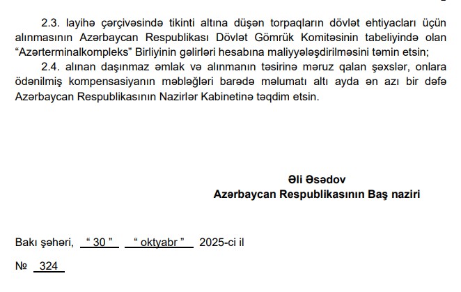 Dövlət Gömrük Komitəsi alınan torpağın, həmçinin həmin torpağın hər bir mülkiyyətçisinə məxsus hissələrinin və onlarla birlikdə alınacaq digər əmlakın qiymətləndirilməsi üçün qiymətləndirmə komissiyası yaratmalı, dövlət sərhədindən buraxılış məntəqələrinin genişləndirilməsi məqsədilə layihə altına düşən alınan daşınmaz əmlakın dövlət ehtiyacları üçün alınmasının "Torpaqların dövlət ehtiyacları üçün alınması haqqında" qanunun tələblərinə uyğun həyata keçirilməsini təmin etməli, layihə çərçivəsində tikinti altına düşən torpaqların dövlət ehtiyacları üçün alınmasının Dövlət Gömrük Komitəsinin tabeliyində olan "Azərterminalkompleks" Birliyinin gəlirləri hesabına maliyyələşdirilməsini təmin etməli, alınan daşınmaz əmlak və alınmanın təsirinə məruz qalan şəxslər, onlara ödənilmiş kompensasiyanın məbləğləri barədə məlumatı altı ayda ən azı bir dəfə Nazirlər Kabinetinə təqdim etməlidir.