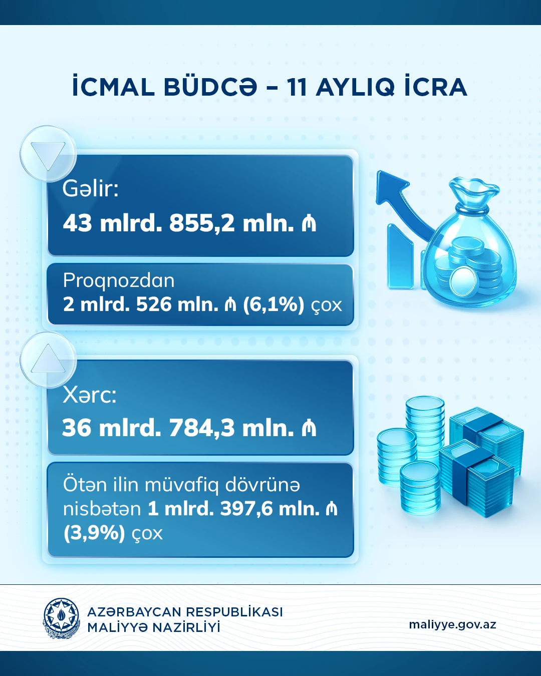 Cari ilin yanvar-noyabr ayları ərzində icmal büdcənin gəlirləri 43 milyard 855,2 milyon manat təşkil edib ki, bu da 11 aylıq proqnozu 2 milyard 526,0 milyon manat və ya 6,1 faiz üstələyib.