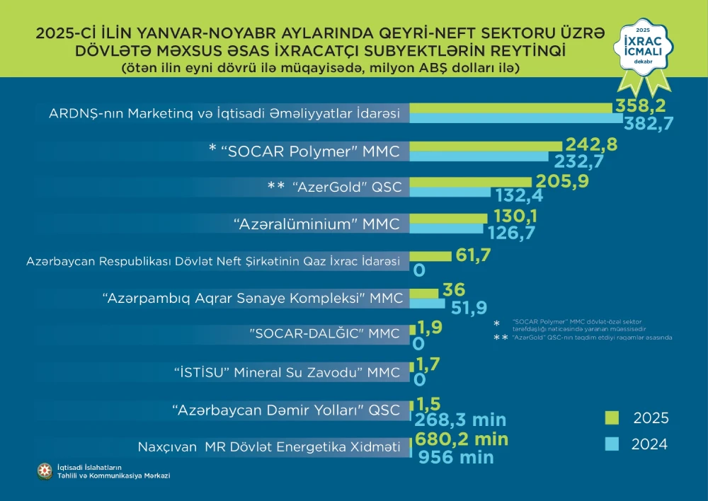 2025-ci ilin yanvar-noyabr ayları üzrə hazırlanmış qeyri-dövlət ixracatçı subyektlərin reytinqində ilk onluqda aşağıdakı şirkətlər təmsil olunublar: "Azərbaycan İnterneyşnl Mayninq Kompani Limited Şi r kət i "nin Azərbayc an Respubl i ka s ında k ı Nümayəndəliyi, "Prime Cotton” MMC, "Azərbaycan Şəkər İstehsalat Birliyi" MMC, "Baku Steel Company" QSC, "Export Stream" Məhdud Məsuliyyətli Cəmiyyəti, “STP Alüminium” MMC,“TABATERRA”QSC, "UYTROP" Məhdud Məsuliyyətli Cəmiyyəti, "KHAN-EL" MMC ,"PAQRO" MMC.