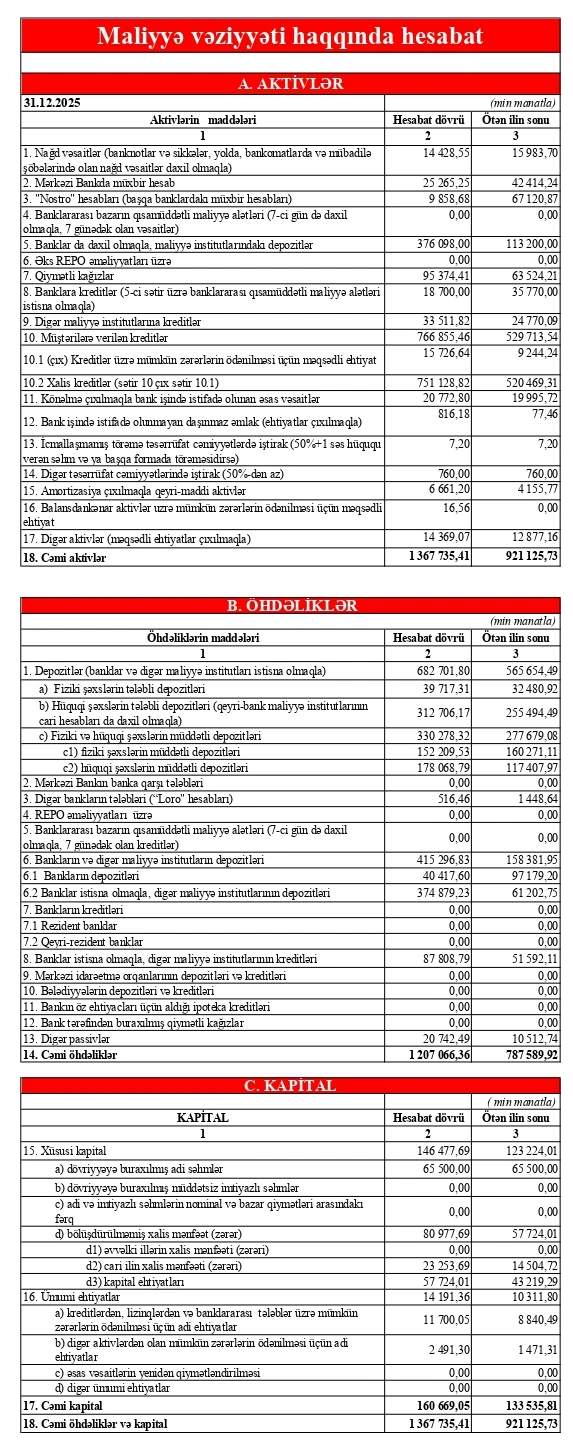 Ümumilikdə, kapital mövqeyinin möhkəmlənməsi və maliyyə göstəricilərində müşahidə olunan müsbət dinamika “Ziraat Bank Azərbaycan” ASC-nin 2025-ci ili maliyyə baxımından uğurla başa vurduğunu, orta və uzunmüddətli perspektivdə isə sabit və idarəolunan artım potensialına malik olduğunu deməyə əsas verir.