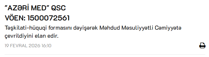 Aparıcı tibbi tədarükçülərdən biri "AZƏRİ MED" şirkəti təşkilati-hüquqi formasını dəyişib.
