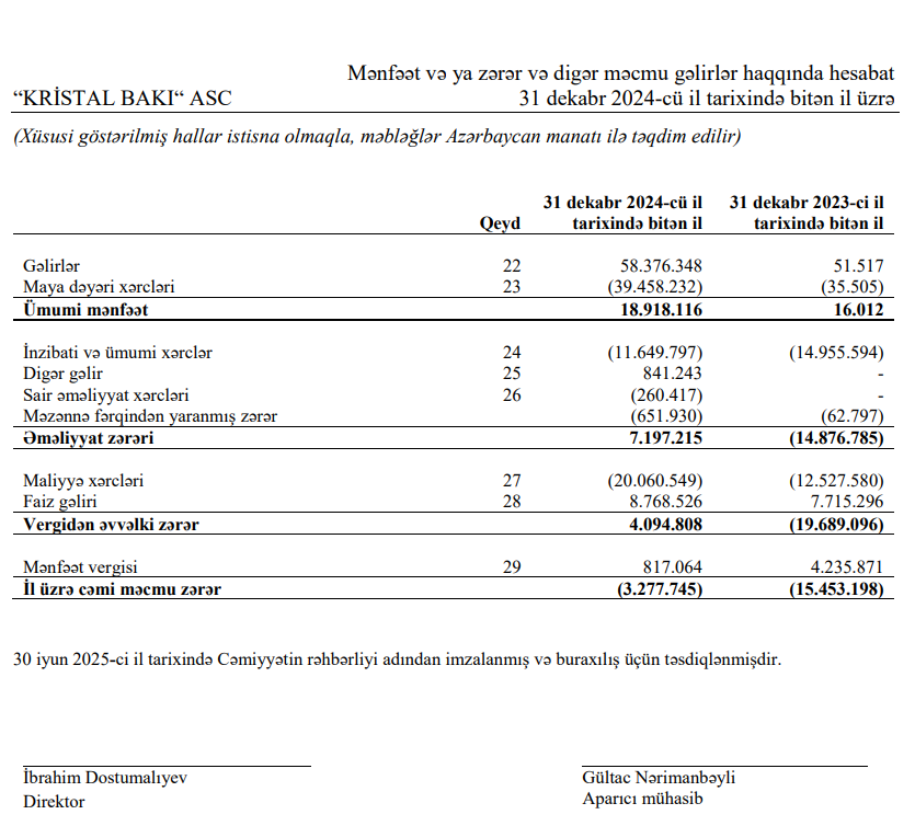 2024-cü ildə "Kristal Bakı" ASC-nin cəmi gəlirləri (əməliyyat, maliyyə və digər gəlirləri) 67 milyon 986 min manat, cəmi xərcləri 72 milyon 81 min manat, vergidən əvvəlki zərəri 4 milyon 95 min manat təşkil edib. Şirkətin mənfəət vergisi üzrə 817 min manat xərci də olub.