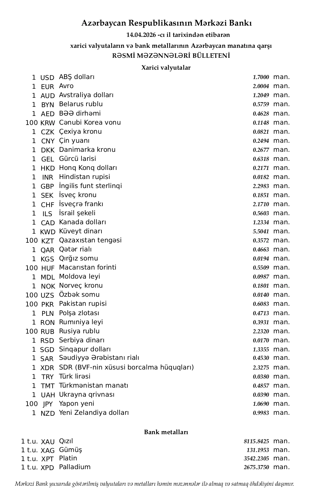 Rəsmi məzənnələr açıqlandı