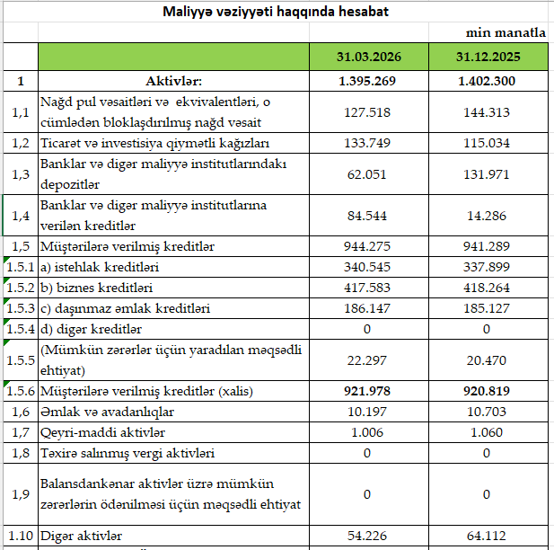 VTB (Azərbaycan) 2026-cı ilin birinci rübü üzrə maliyyə nəticələrini açıqlayıb