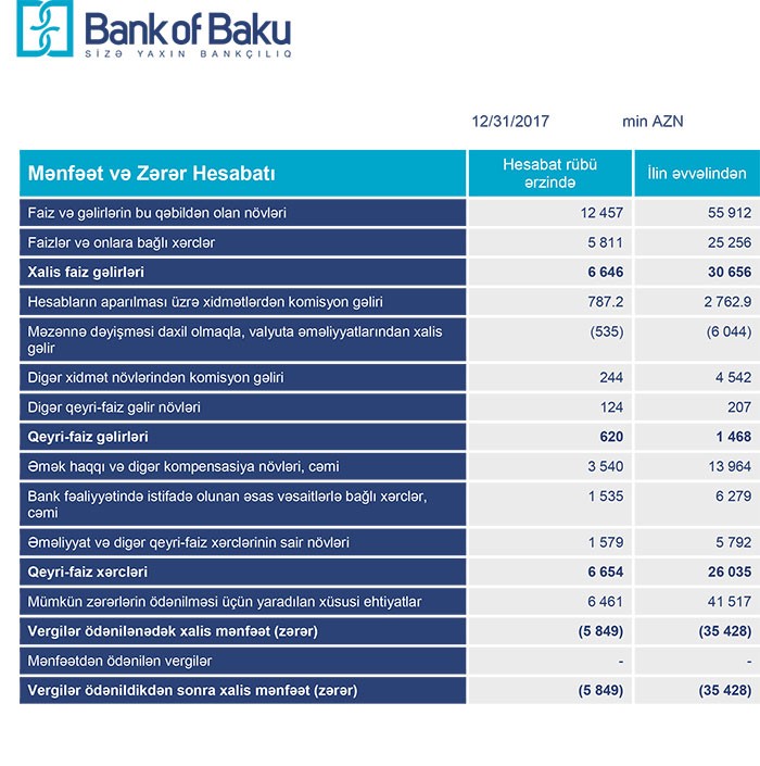 “Bank of Baku” ASC 2017-ci ilin yekunu üzrə maliyyə göstəricilərini açıqlayıb.