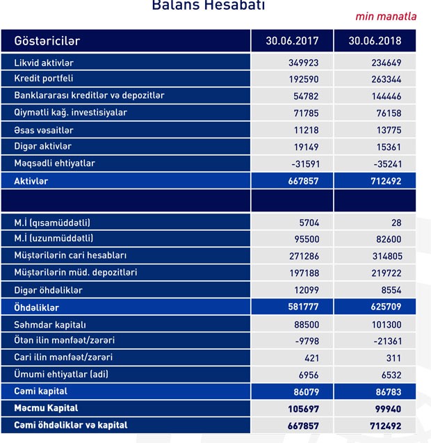 Banklararası kreditlər və depozitlər isə 2,6 dəfə artaraq 144 milyon 446 min manata yüksəlib. Balansın bu maddələri üzrə artım nəticəsində “Rabitəbank”ın cəmi aktivləri 6,7% artaraq 30.06.2018-ci il tarixində 712 milyon 492 min manata çatıb. Bank 30.06.2017-ci il tarixində 667 milyon 857 min manat cəmi aktivlərə malik idi.