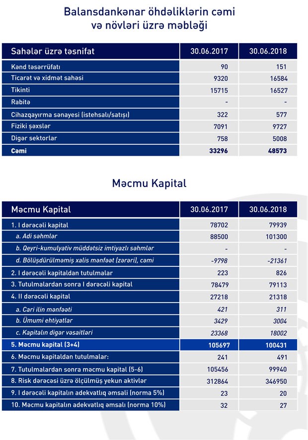 "Rabitəbank" 30 İyun 2018-ci il tarixində 99 milyon 940 min manat məcmu kapitala malik olub, bu da minimal tələbdən təxminən 2 dəfə çoxdur.