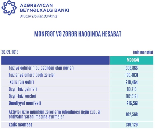 Xərclər çıxıldıqdan sonra ABB-nin əməliyyat mənfəəti 216 milyon 561 min manat təşkil edib. Eyni zamanda, ehtimal olunan kredit və depozit itkiləri üçün yaradılmış ehtiyatların 102 milyon 568 min manatı azad olub və mənfəətə əlavə edilib. Bu səbəbdən Bankın xalis mənfəəti 319 milyon 129 min manat təşkil edib.