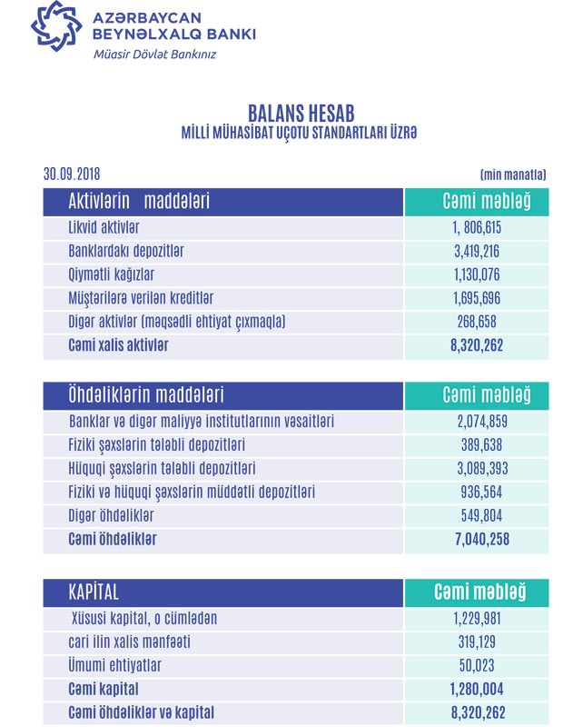 30.09.2018-ci il tarixində ABB-nin cəmi aktivləri 8 milyard 320 milyon manat, cəmi öhdəlikləri 7 milyard 40 milyon manat, cəmi balans kapitalı isə 1 milyard 280 milyon manat təşkil edib.