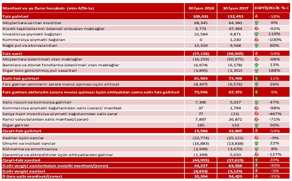 Faiz gəlirlərinin 18%, qeyri-faiz gəlirlərinin isə 54% azalması xalis mənfəətin azalması ilə nəticələnib.