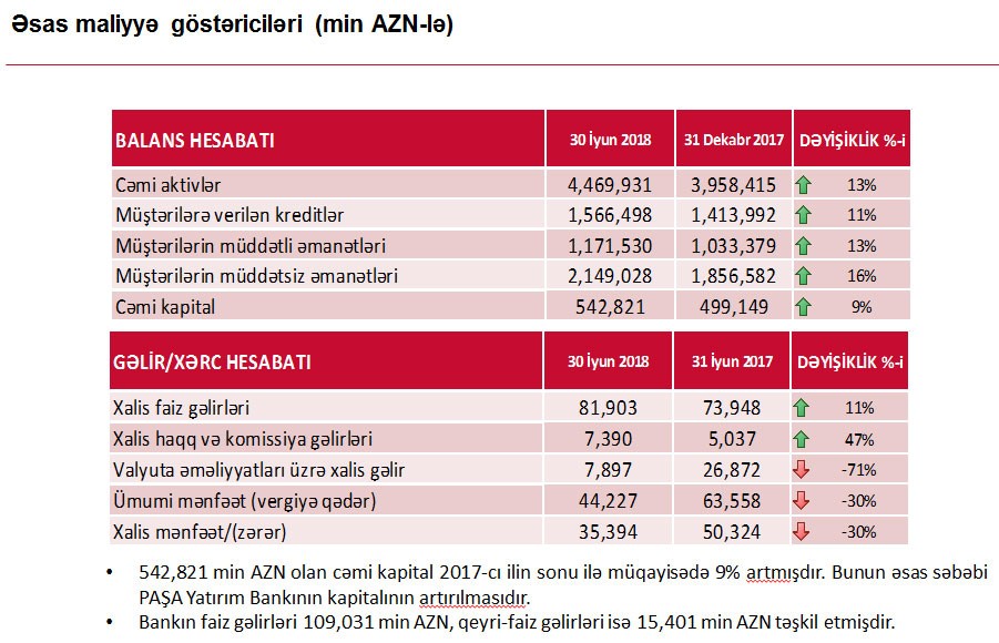 “Marja”nın məlumatına görə, bu barədə PAŞA Bankın 30 iyun 2018-ci il tarixinə maliyyə nəticələrinə həsr olunmuş mətbuat konfransında Bankın İdarə Heyətinin üzvü, Baş Maliyyə İnzibatçısı Bəhruz Nağıyev bildirib.