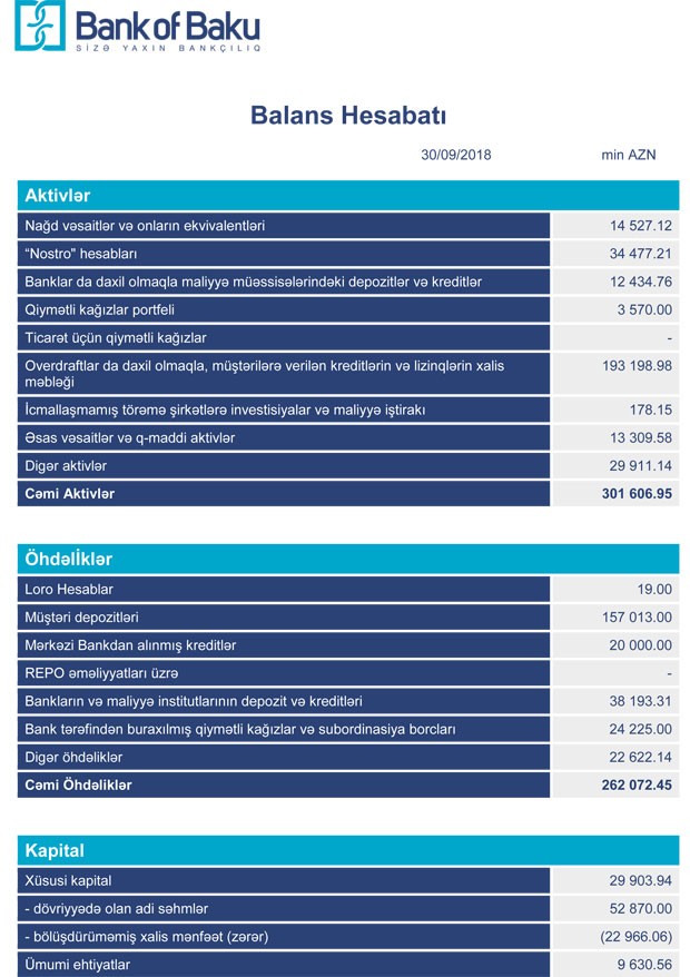 30 Sentyabr 2018-ci il tarixində “Bank of Baku” 301 milyon 606 min manat cəmi aktivlərə (o cümlədən 193 milyon 199 min manatı müştərilərə verilmiş kreditlər), 262 milyon 72 min manat cəmi öhdəliklərə və 39 milyon 534 min manat cəmi balans kapitalına malik olub.