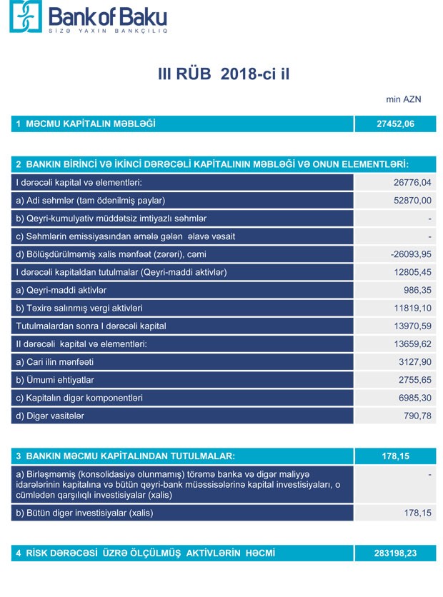 Cari ilin mənfəəti hesabına Bankın məcmi kapitalı ötən ilin sonundakı 24 milyon 611 min manatdan 30 Sentyabr 2018-ci il tarixində 27 milyon 452 min manata çatıb.