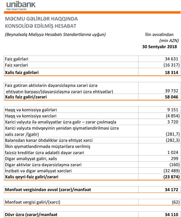 “Unibank” ASC 2018-ci ilin 9 ayını 34 milyon 110 min manat xalis mənfəət ilə başa vurub. Müqayisə üçün qeyd edək ki, Bank 2017-ci ilin eyni dövrünü 10 milyon 755 min manat xalis zərər ilə bağlamışdı.