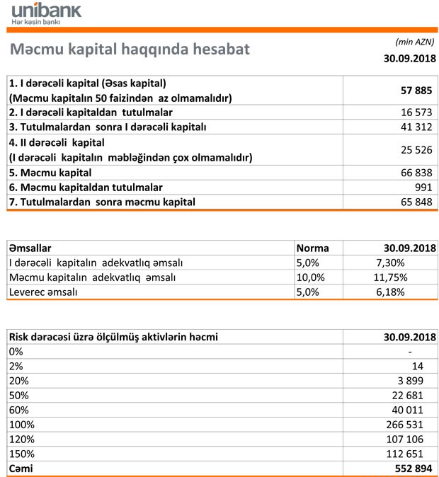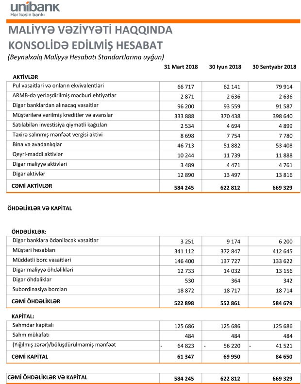 30 Sentyabr 2018-ci il tarixində “Unibank” 669 milyon 329 min manat cəmi aktivlərə, 584 milyon 679 min manat cəmi öhdəliklərə və 84 milyon 650 min manat cəmi balans kapitala malik olub.