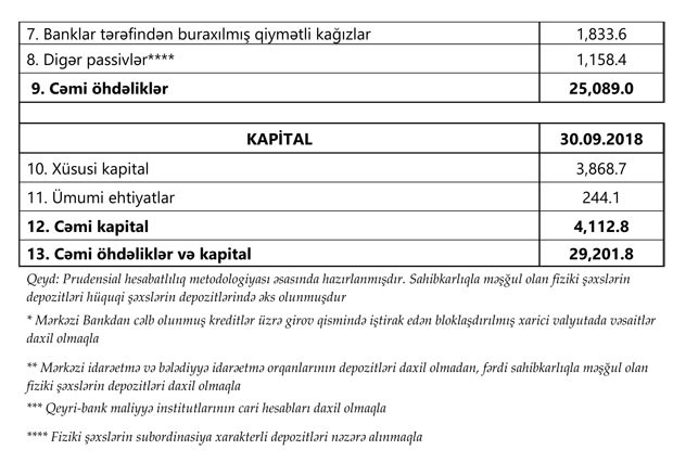 2018-ci ilin sentyabr ayı ərzində bank sektorunun aktivləri 3.8% (1 milyard 74.7 milyon manat), öhdəlikləri 4.2% (1 milyard 11.5 milyon manat), balans kapitalı isə 1.6% (63.2 milyon manat) artıb.