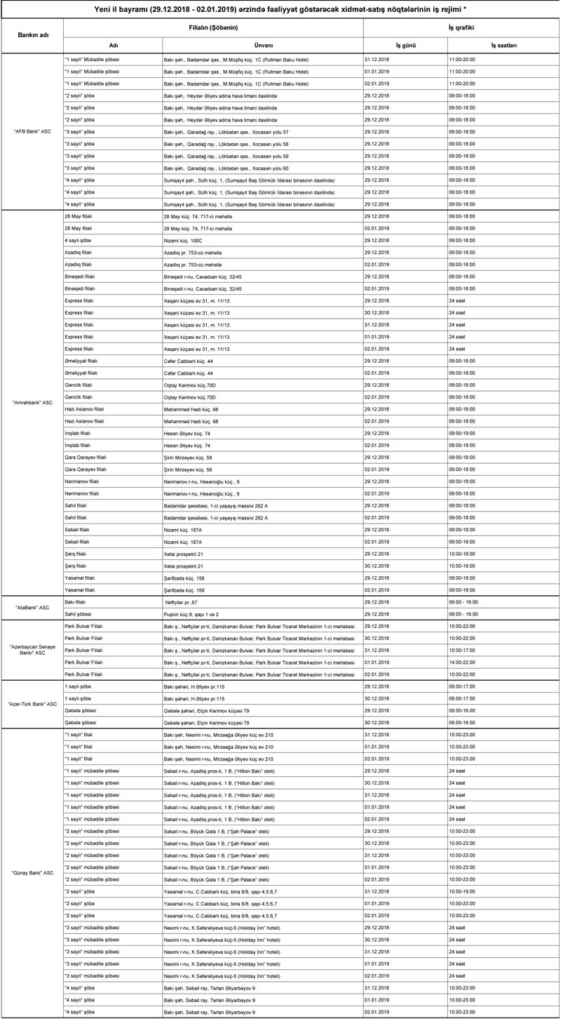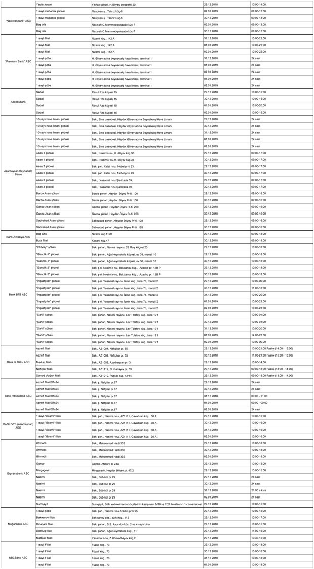 Bayram günlərində ölkəmizdə səfərdə olan turistlərin və ölkə vətəndaşlarının valyuta mübadiləsi xidmətlərinə rahat çıxış imkanlarının təmin edilməsi məqsədilə ümumilikdə 23 bankın 118 filial və şöbəsi (9 bank üzrə 12 satış nöqtəsi 24 saat rejimində olmaqla) 29 Dekabr – 02 Yanvar tarixlərində müştərilərə xidmət göstərəcək.