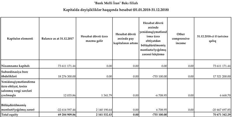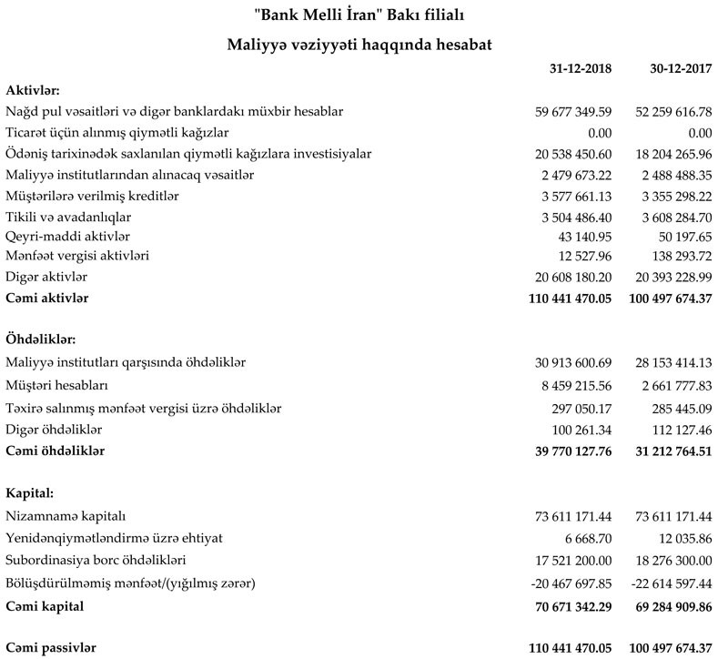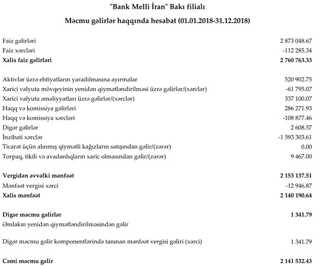 "Bank Melli İran" Bakı filialı 2018-ci ili 2 milyon 141 min 532 manat xalis mənfəət ilə başa vurub. Halbuki filial 2017-ci ili 6 milyon 924 min 515 manat xalis mənfəət ilə bağlamışdı. Beləliklə, bankın xalis mənfəəti 3,2 dəfə azalıb.