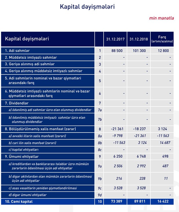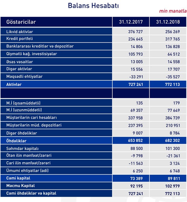 2017-ci illə müqayisədə isə Bankın cəmi aktivləri 44 milyon 872 min manat və ya 6,2% artaraq 772 milyon 113 min manata qalxıb.
