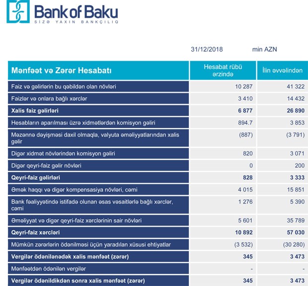 “Bank of Baku” ASC 2018-ci ili 3 milyon 473 min manat xalis mənfəət ilə başa vurub. Halbuki, Bank 2017-ci ildə ehtimal olunan depozit və kredit itkiləri üçün yaradılan xüsusi ehtiyatlara 41 milyon 517 min manat ayırdığından həmin ili 35 milyon 428 min manat zərər ilə başa vurmuşdu.