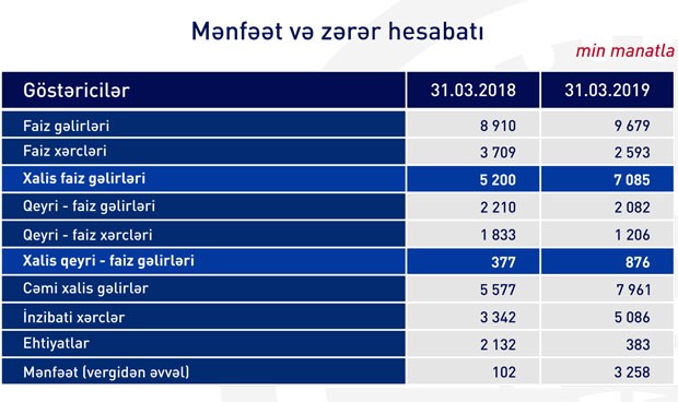 “RabitəBank” ASC 2019-cu ilin 1-ci rübünü 3 milyon 258 min manat mənfəətlə (vergidən əvvəl) başa vurb. Bu, 2018-ci ilin eyni dövrü ilə müqayisədə 32 dəfə çoxdur. Bank 2018-ci ilin 1-ci rübünü 102 min manat mənfəətlə bağlamışdı.