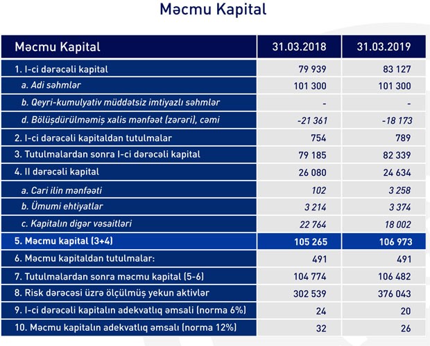 31 Mart 2019-cu il tarixində "RabitəBank"ın məcmu kapitalı 106 milyon 973 min manat təşkil edib.