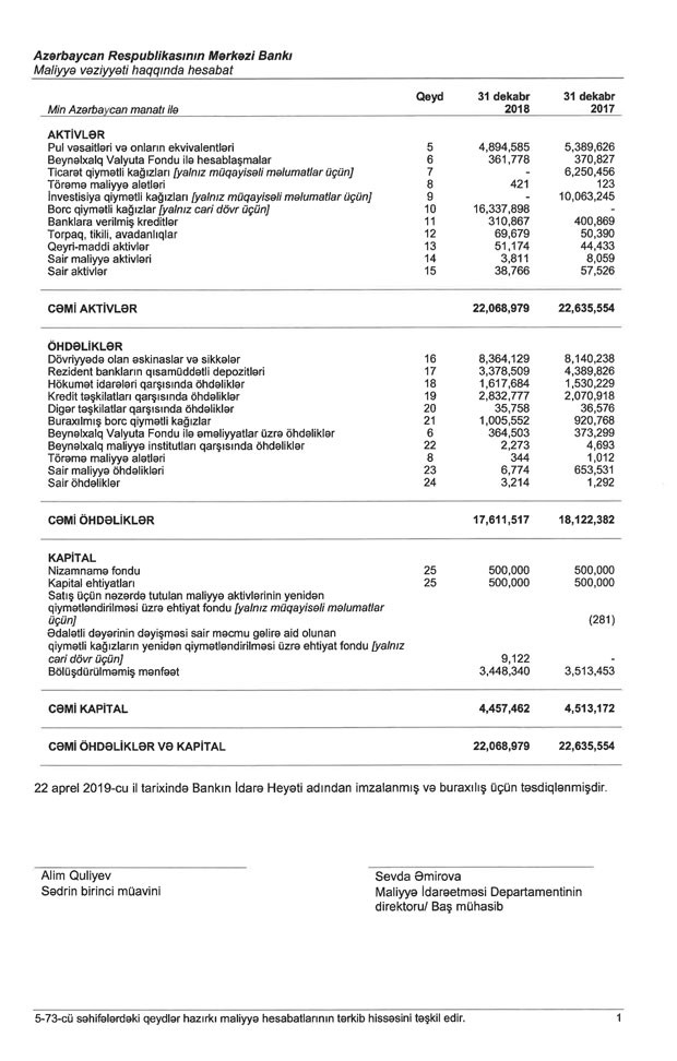 Mərkəzi Bank 2018-ci ili 60 milyon 316 min manat zərərlə başa vurub. Halbuki, qurum 2017-ci ildən 3 milyard 513 milyon manat mənfəətlə çıxmışdı. Bunun səbəbi Neft Fondundan 3 milyard 949 milyon manat transfertlər olmuşdu.