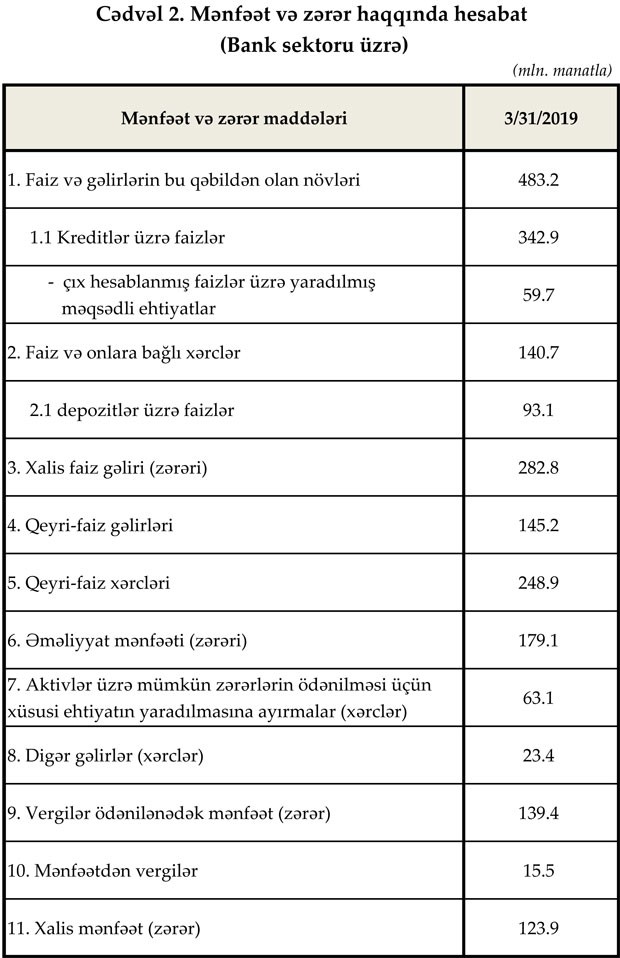 Mart ayında bankların əməliyyat mənfəəti 179.1 milyon manat, xalis mənfəəti isə 123.9 milyon manat təşkil edib. Ötən ilin müvafiq dövrü ilə müqayisədə faiz gəlirləri 12.9%, kreditlər üzrə faiz gəlirləri isə 19.5% artıb.