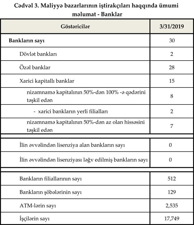 Fəaliyyət göstərən 30 bankın filiallarının sayı 512, şöbələrinin sayı 129, ATM-lərin sayı 2535 olub. Bank sektorunun işçi heyətinin sayında artım mart ayında da davam etmişdir. Belə ki, 2019-cu ilin mart ayında işçi sayı 0.4% (66 nəfər) artaraq 17 min 749 nəfər təşkil edib.