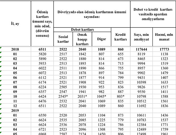 2018-ci ilin sonu ilə müqayisədə isə yanvar-may ayları ərzində (ilk 5 ayda) cəmi ödəniş kartlarının sayı 457 min ədəd, o cümlədən sosial kartların sayı 65 min ədəd, əmək haqqı kartlarının sayı 84 min ədəd, sosial kart və əməkhaqqı kartı olmayan digər debet kartlarının sayı isə 361 min ədəd artıb. Kredit kartlarının sayı isə 54 min ədəd azalıb.