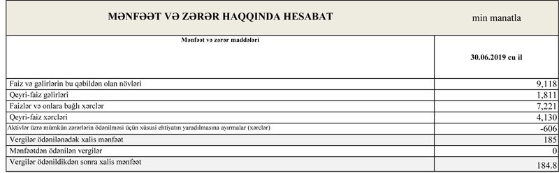 “NBC Bank” ASC 2019-cu ilin birinci yarısını (yanvar-iyun) 184.8 min manat xalis mənfəət ilə başa vurub. Müqayisə üçün qeyd edək ki, cari ilin 1-ci rübündə (yanvar-mart) Bank, əsasən ehtiyata ayırma ilə əlaqədar olaraq 594.9 min manat zərərə düşmüşdü. Beləliklə, ikinci rübdə “NBC Bank” yenidən mənfəətə çıxıb.