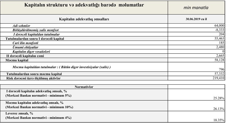 30 İyun 2019-cu il tarixində "NBC Bank" 57 milyon 332 min manat məcmu kapitala malik olub. Ötən ilin sonunda Bankın məcmu kapitalı 57 milyon 88 min manat təşkil etmişdi.