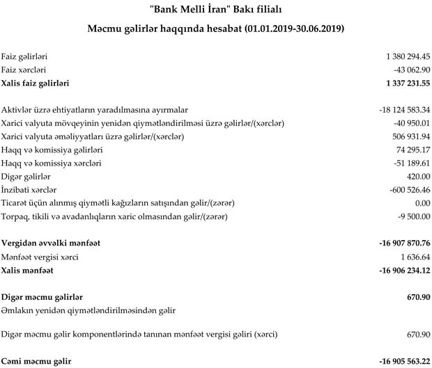 "Bank Melli İran" Bakı filialı 2019-cu ilin 1-ci yarısını (yanvar-iyun dövrünü) 16 milyon 905 min manat xalis zərər ilə başa vurub. Filial 2019-cu ilin 1-ci rübünü (yanvar-mart dövrünü) 8 milyon 602 min manat zərər ilə bağlamışdı. Beləliklə, ikinci rübdə də "Bank Melli İran" Bakı filialının zərəri artıb.