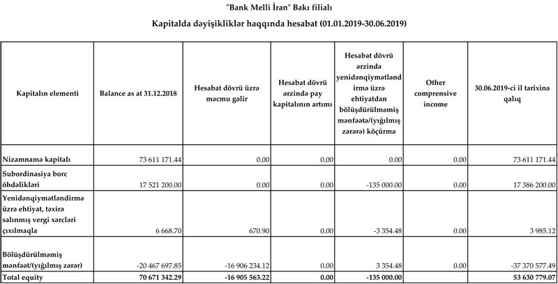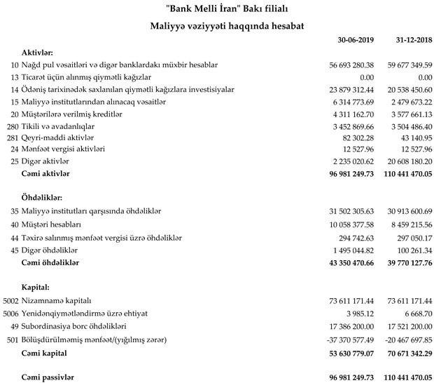 2019-cu ilin ilk 6 ayının zərəri daxil "Bank Melli İran" Bakı filialının yığılmış zərəri 37 milyon 371 min manata yüksəlib. Bu səbəbdən Bankın cəmi balans kapitalı 70 milyon 671 min manatdan 53 milyon 630 min manata düşüb.