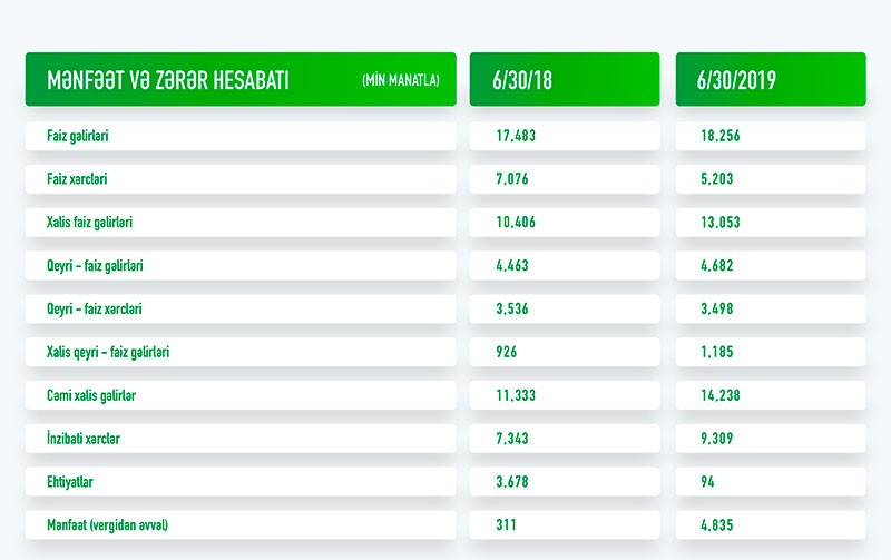 “Rabitəbank” ASC 2019-cu ilin 1-ci yarısını 4 milyon 835 min manat vergidən əvvəl mənfəət ilə başa vurub. 2018-ci ilin eyni dövrü ilə müqayisədə Bankın vergidən əvvəl mənfəəti 15,5 dəfə artıb. “Rabitəbank” 2018-ci ilin 1-ci yarısını 311 min manat vergidən əvvəl mənfəət ilə bağlamışdı. Mənfəətin artmasının səbəbləri gəlirlərin artması və ehtiyata ayırmanın azalmasıdır.