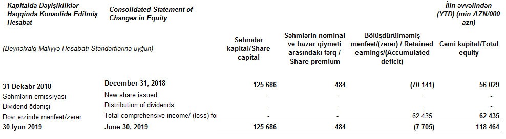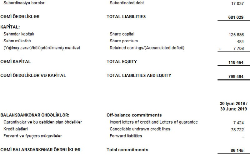 2019-cu ilin 1-ci yarısında xalis mənfəətin kəskin artması ilə əlaqədar olaraq Bankın cəmi kapitalı 2 dəfədən çox artıb. Ötən ilin sonunda 55 milyon 236 min manat təşkilm etmiş cəmi kapital 30 İyun 2019-cu il tarixində 118 milyon 464 min manat təşkil edib.