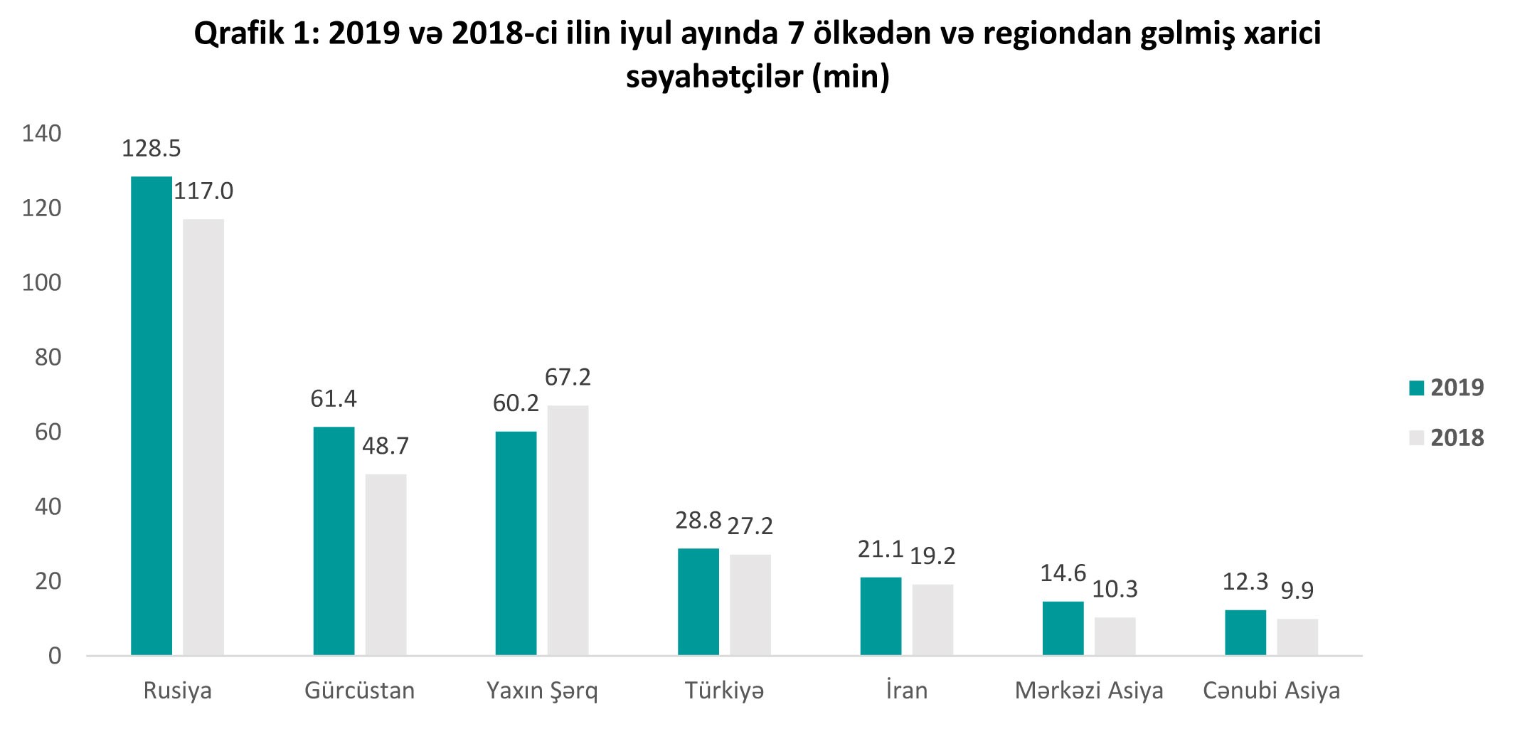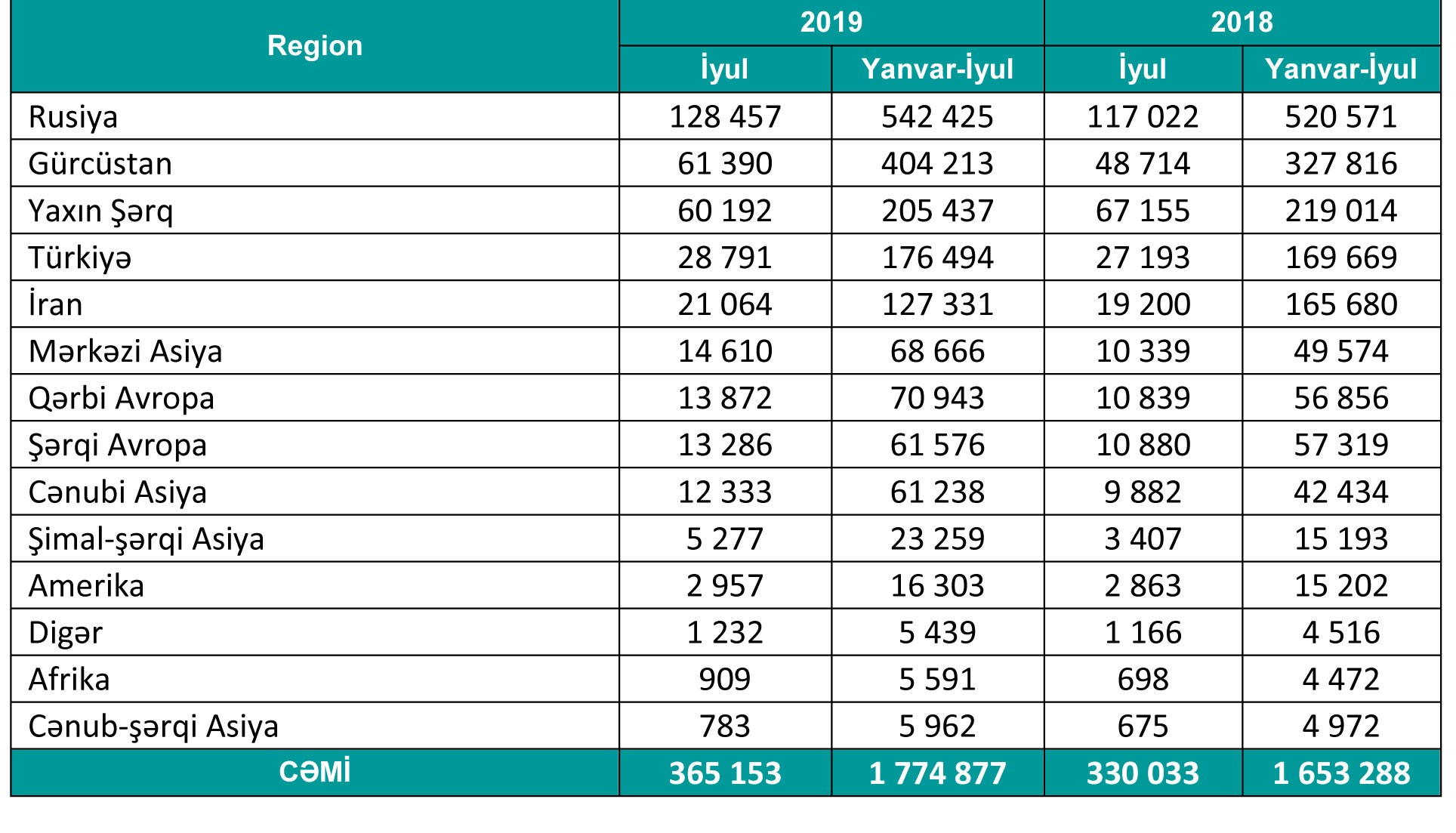 Dövlət Turizm Agentliyinin yaydığı məlumata görə, 2019-cu ilin iyul ayında Azərbaycana 365 min əcnəbi qonaq səfər edib ki, bu da 2018-ci ilin iyul ayına nisbətdə 10.6% artım deməkdir.