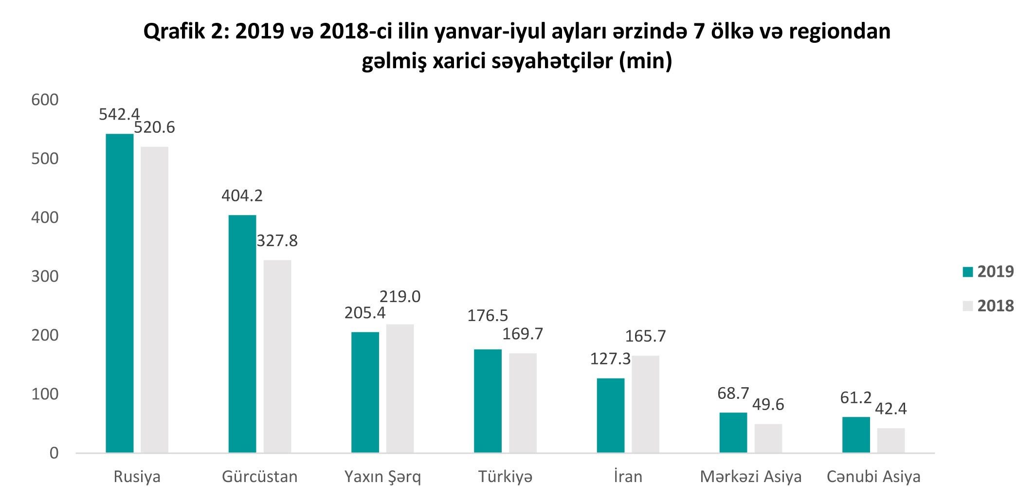 Cari ilin yanvar-iyul aylarında Azərbaycanı 1.8 milyon xarici səyahətçi ziyarət edib ki, bu da 2018-ci ilin ilk yeddi ayı ilə müqayisədə 122 min və ya 7.4% çoxdur.