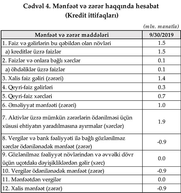 Məlumata görə, 9 ay ərzində kredit ittifaqlarının əməliyyat gəlirləri 1,8 milyon manat, əməliyyat xərcləri 0,8 milyon manat, xüsusi ehtiyatlara ayırmaları 1,9 milyon manat təşkil edib.