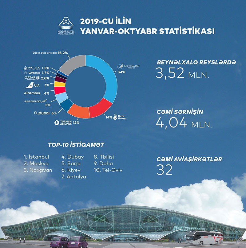 2019-cu ilin oktyabr ayı ərzində Heydər Əliyev Beynəlxalq Aeroportundan 32 sərnişin aviaşirkəti 60-dan çox müxtəlif istiqamətə uçuşlar həyata keçirib.