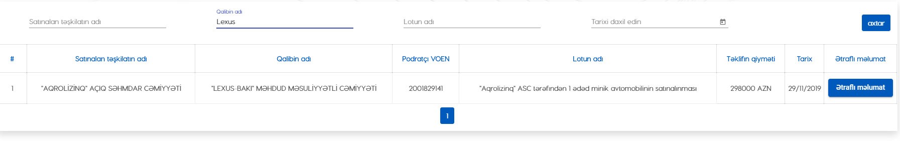 “Aqrolizinq” ASC noyabrın 29-da 298 min manat dəyərində “Lexus” minik avtomobili almaq üçün “Lexus-Bakı” MMC ilə müqavilə bağlayıb. Bu, dövlət şirkətləri üçün rəqabətli satınalma proseduru yolu ilə əldə edilən ən bahalı avtomobillərdən biridir.