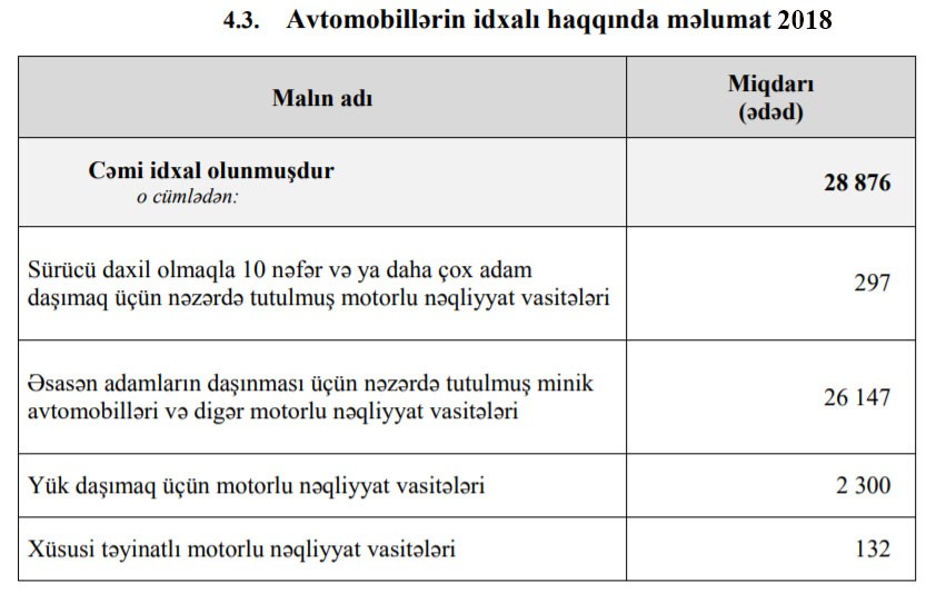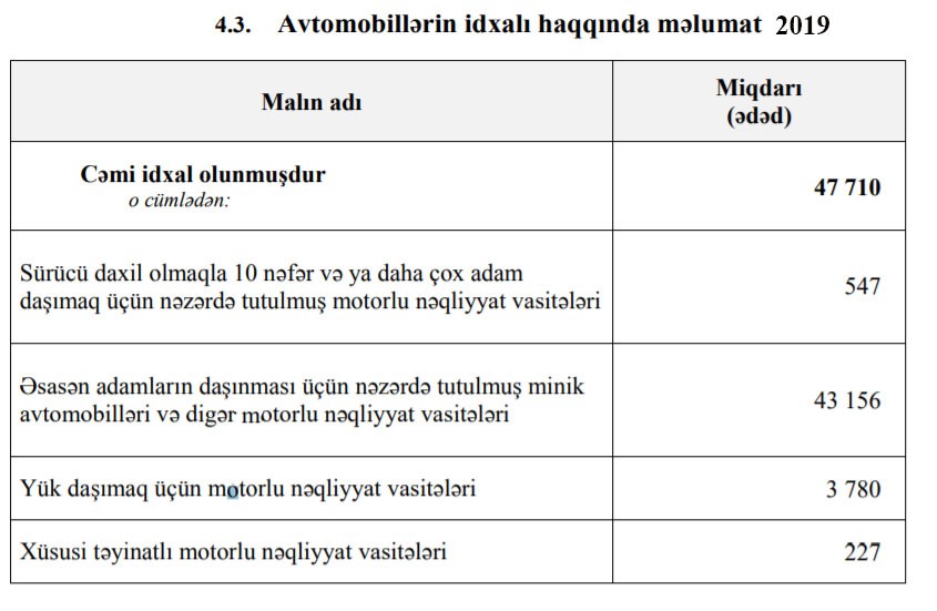 O cümlədən, 2019-cu ilin yanvar-dekabr aylarında Azərbaycana 43 min 56 ədəd minik avtomobilləri, 547 ədəd avtobus, 3 min 780 ədəd yük avtomobili və 227 ədəd xüsusi təyinatlı vasitə idxal olunub.