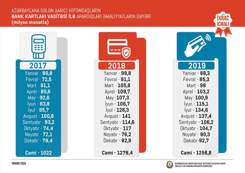 2019-cu ilin dekabr ayında ölkəmizə gələn xarici vətəndaşların bank kartları vasitəsi ilə apardıqları əməliyyatları 2018-ci ilin dekabr ayı ilə müqayisədə 11,8 faiz artaraq 93 milyon manat təşkil edib. Ümumilikdə isə 2019-cu ilin yanvar-dekabr ayları ərzində Azərbaycana gələn xarici vətəndaşların bank kartları vasitəsi ilə apardıqları əməliyyatların dəyəri 1 milyard 257 milyon manat təşkil edib.