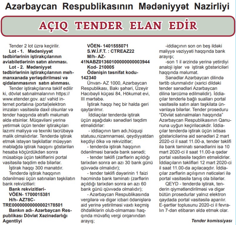 Mədəniyyət Nazirliyi 2 lot üzrə açıq tender keçirilir.