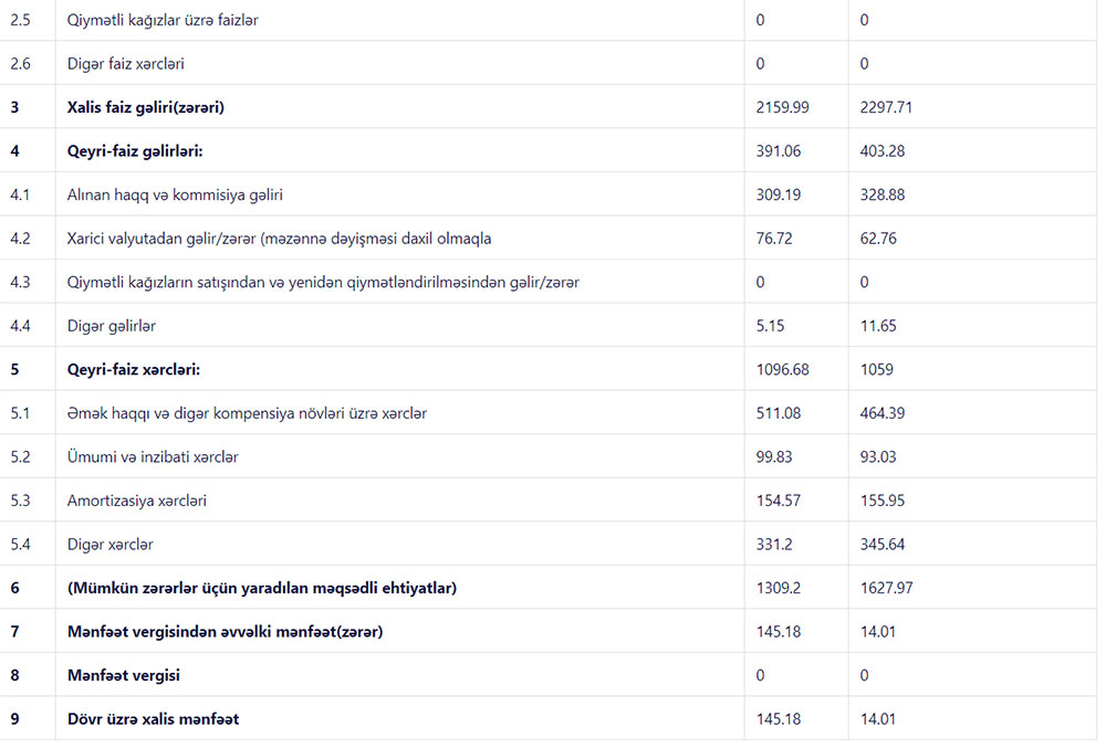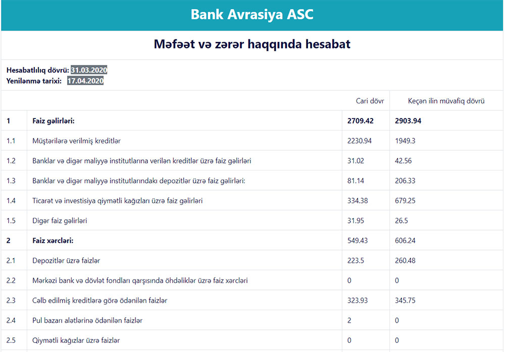 Xatırladaq ki, ötən ilin yanvar-mart dövründə “Bank Avrasiya”nın cəmi gəlirləri 3 milyon 299 min manat, cəmi xərcləri isə 1 milyon 665 min manat təşkil etmiş, gəlirlər xərcləri üstələdiyindən Bankın 1 milyon 634 min manat əməliyyat mənfəəti yaranmışdı. Bank əməliyyat mənfəətinin 1 milyon 628 min manatını ehtimal olunan depozit və kredit itkiləri üzrə yaradılan ehtiyyata ayırdığından mənfəəti 5.9 min manata düşmüşdü. 8.2 min manat gözlənilməz fəaliyyət növlərindən və əvvəlki dövr üçün uçotdakı dəyişikliklərdən mənfəət daxil Bankın yekun mənfəəti 14,1 min manat təşkil etmişdi.