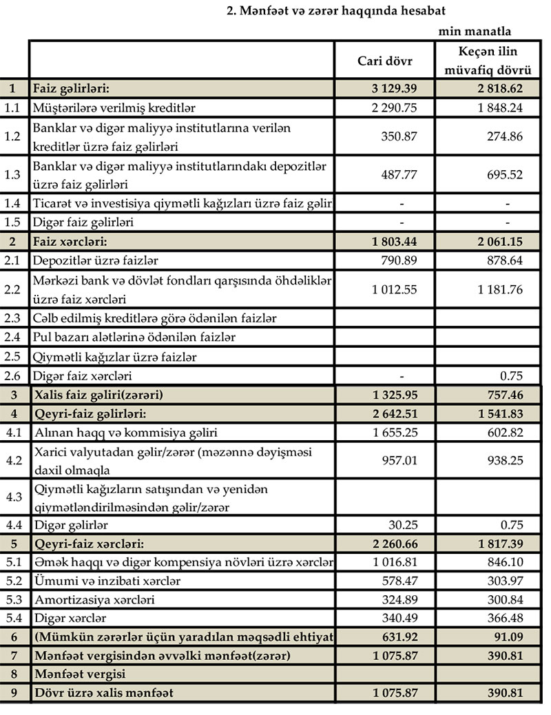Müqayisə üçün qeyd edək ki, 2019-cu ilin ilk rübündə GünayBankın cəmi əməliyyat gəlirləri 4 milyon 359 min manat, cəmi əməliyyat xərcləri 3 milyon 878 min manat, əməliyyat mənfəəti 481 min manat təşkil etmişdi. Bank mümkün zərərlər üçün yaradılan məqsədli ehtiyata 91 min manat ayırdığından mənfəət 390 min manata düşmüşdü.