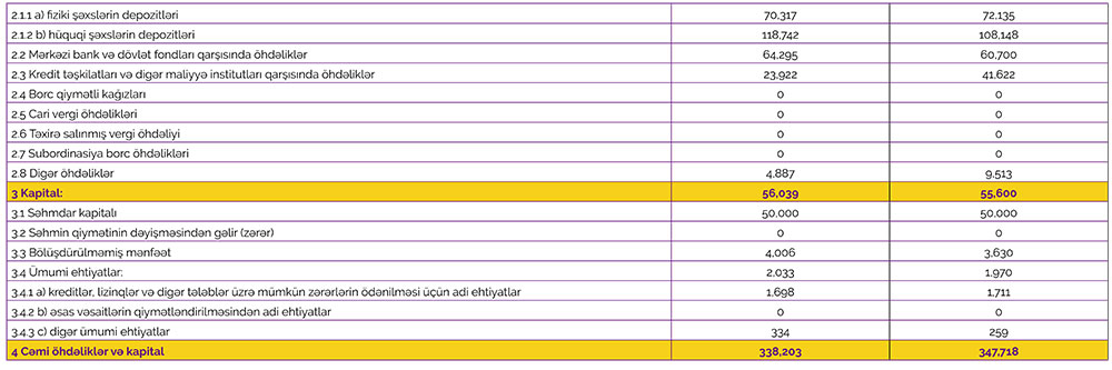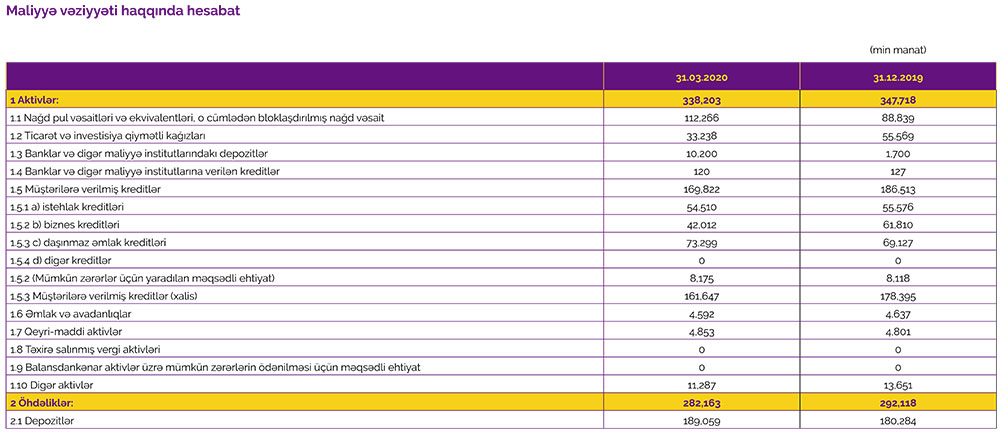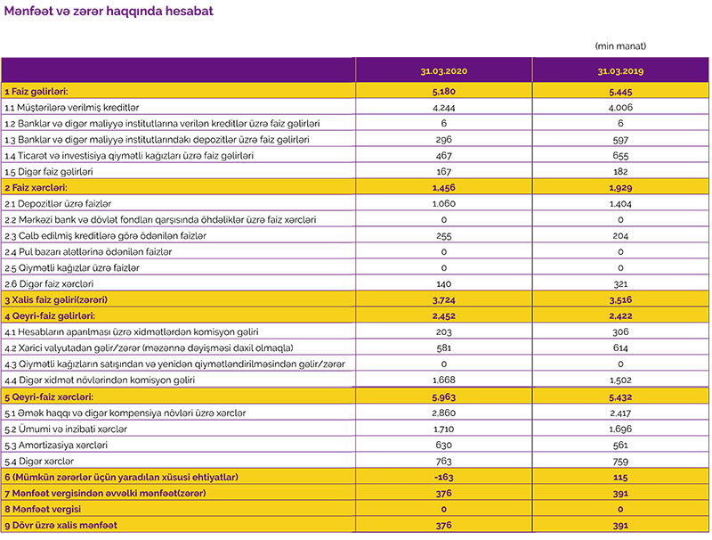 2019-cu ilin 1-ci rübündə faiz gəlirləri 5 milyon 445 min manat, qeyri – faiz gəlirləri isə 2 milyon 422 min manat ikən, 2020-ci ilin 1-ci rübündə faiz gəlirləri 5 milyon 180 min manat və qeyri – faiz gəlirləri 2 milyon 452 min manat təşkil edib.