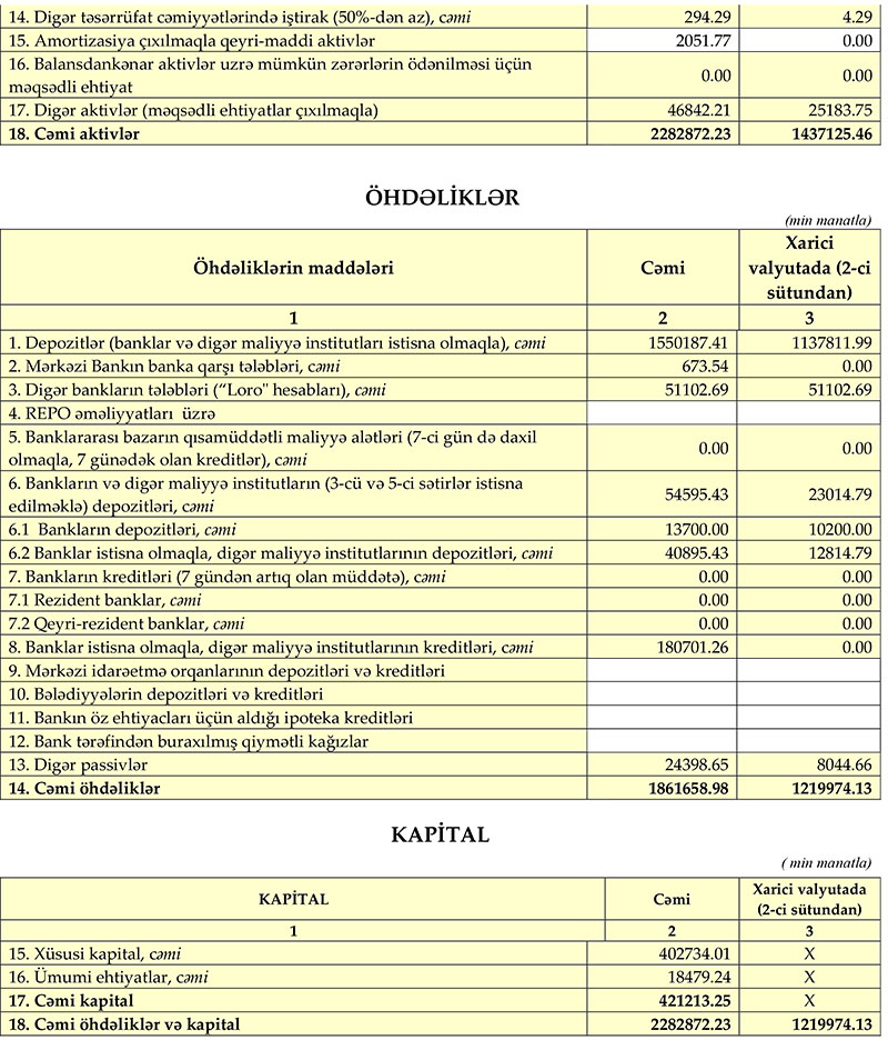 Bankın 1 aprel 2020-ci il tarixinə cəmi kapitalı 421 milyon manat təşkil etmişdir.