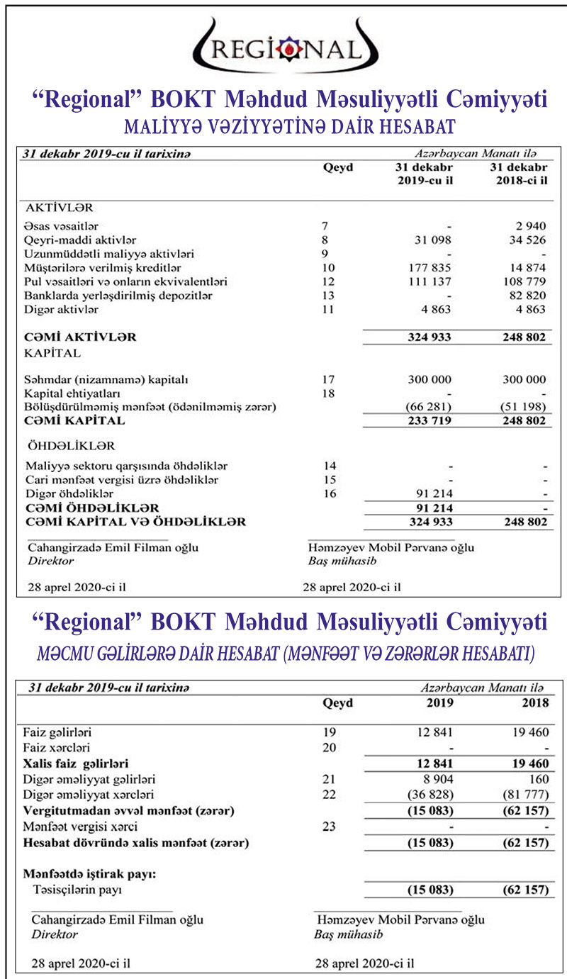 Marja BOKT-un maliyyə hesabatına istinadən xəbər verir ki, 2018-ci illə müqayisədə 2019-cu ildə “Regional”ın faiz gəlirləri 34% azalaraq 12 min 841 manat təşkil edib.