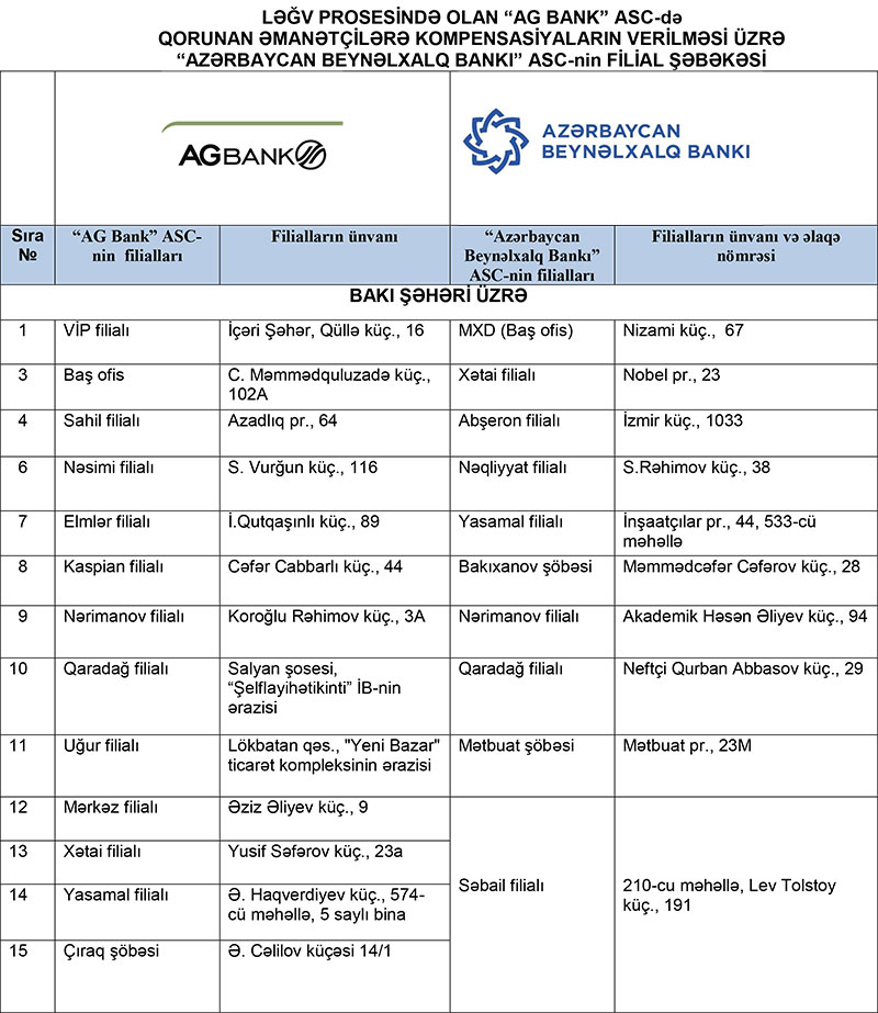 Əlavə olunan cədvələ uyğun olaraq qorunan əmanətçilər ləğv prosesində olan “AG Bank” ASC və “NBC Bank” ASC-də əmanətləri olduğu filialın qarşısında qeyd edilən “Azərbaycan Beynəlxalq Bankı” ASC-nin filialına müraciət edərək yuxarıda qeyd edilən sənədlər əsasında kompensasiyalarını əldə edə bilərlər.